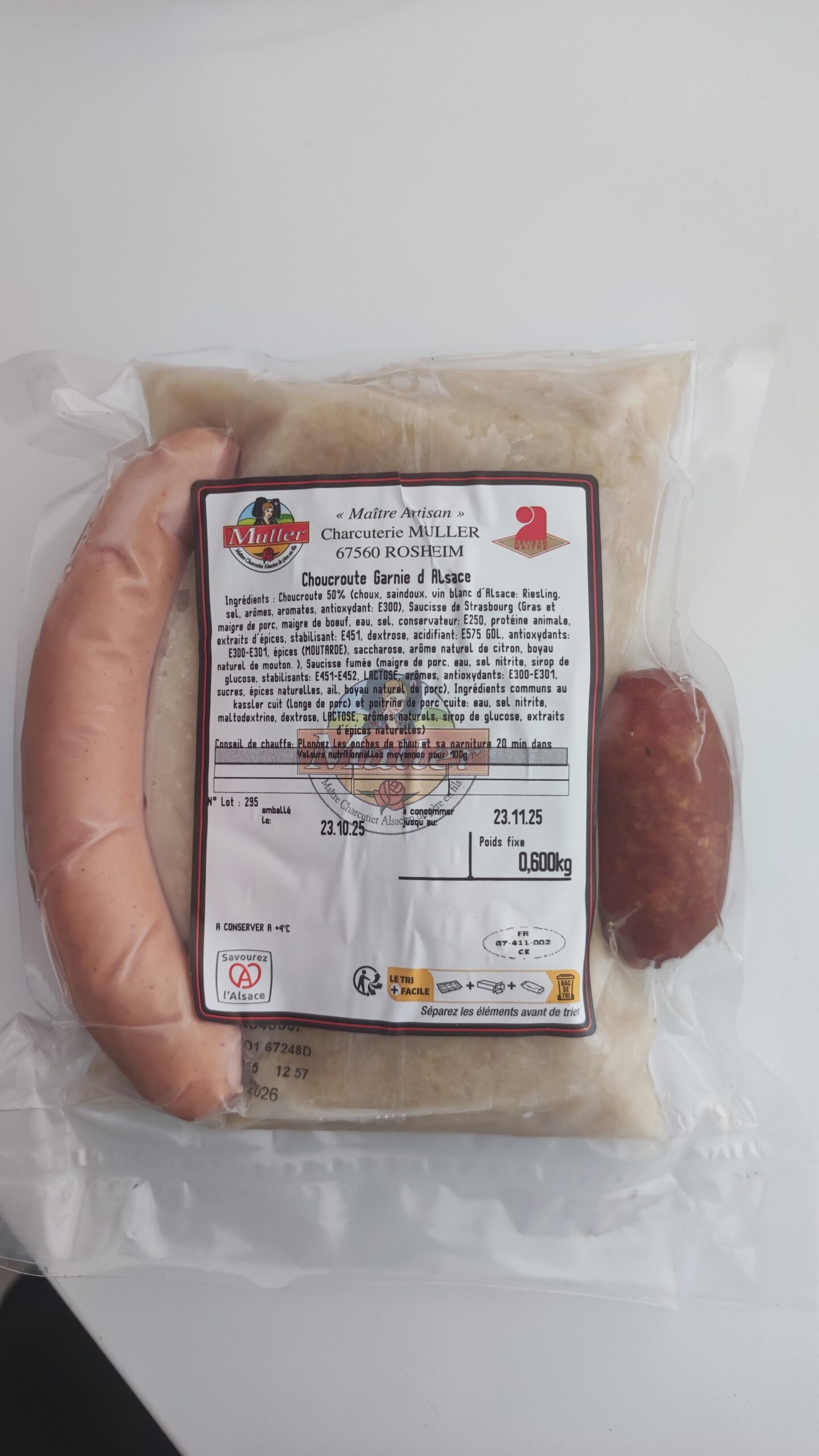 Choucroute au chaudron IGP, une knack, une petite montbeliard, kassler fumé (viande traditionnelle de choucroute alsacienne), lard salé, lard fumé.