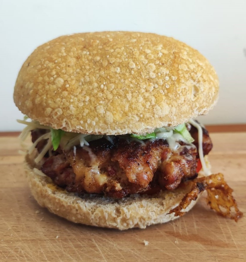 Buns artisanal, steak maison 100% lard artisanal fumé, moutarde alsacienne, tomate et salade avec sauce maison et emmental.